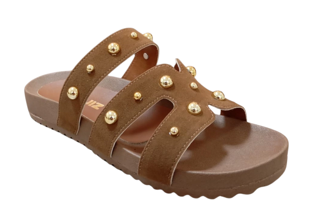 Essa rasteira slide da marca Quiz é a combinação perfeita entre elegância e praticidade. Com tiras largas em acabamento tipo camurça na cor marrom e aplicação de tachas douradas, ela garante um visual moderno e cheio de personalidade.